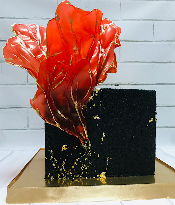 Торт у формі куба, покритий чорним шоковелюром із золотими бризками. Основний акцент — червоні твіст-листи, складені в оригінальну об’ємну композицію, що додає святковому десерту виразності та стильного контрасту.