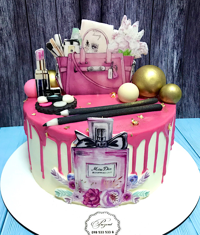 Стильний торт для дівчини в біло-рожевій кольоровій гамі. Декор виконаний у вишуканому та модному стилі: зверху розташована сумочка- косметичка, з якої виглядають блокнот, квіти та косметика. На поверхні торта розміщені тіні, олівці, помада та шоколадні кулі, що додають яскравих акцентів. Спереду торт прикрашений баночкою парфумів Dior, оздобленою квітами — елегантна деталь, що підкреслює жіночність і витонченість свята
