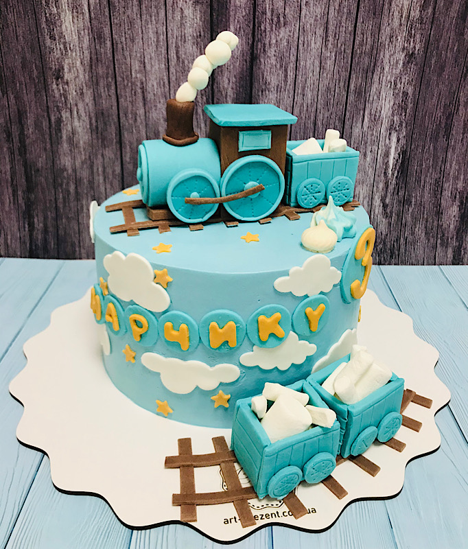 Блакитний торт для маленького мрійника. Зверху — їстівна фігурка паровозика з вагончиком, який мчить по рейках, а на підставці — ще два вагончики, що везуть пухкі маршмелоу. Десерт прикрашений ніжними хмарками та милим написом із цифрою 3 — як символ чарівного свята і дитячої радості. Ідеальний торт для хлопчика, який обожнює потяги та пригоди!