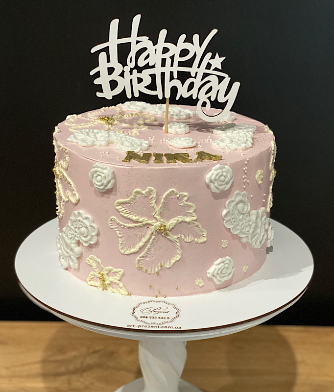 Ніжний рожевий торт у витонченому стилі. Прикрашений білими мереживними візерунками та ніжними квіточками, він виглядає легко й елегантно. Завершує композицію топер Happy Birthday, що додає святкового настрою. Ідеальний вибір для романтичного, жіночного святкування — витончено, ніжно та зі смаком.
