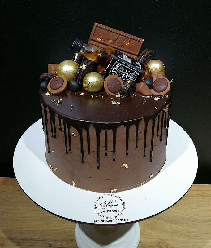 Торт для справжнього чоловіка — покритий насиченим шоколадним ганашем і блискучою шоколадною поливкою. Прикрашений золотими шоколадними кулями, улюбленими солодощами та мініатюрною пляшечкою віскі. Вишуканий, мужній і водночас неймовірно смачний десерт для особливого приводу.