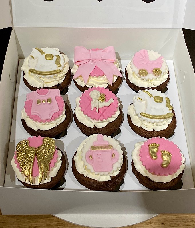 Ніжні капкейки на Христини для дівчинки — у світлих пастельних тонах із делікатним золотим декором. Кожен капкейк прикрашений милими тематичними елементами: пляшечкою, золотими крильцями, коником, ангеликом, бантом, колясочкою, крихітними ніжками та бодіком. Витончена й зворушлива композиція, що наповнює свято теплом, ніжністю та любов’ю.