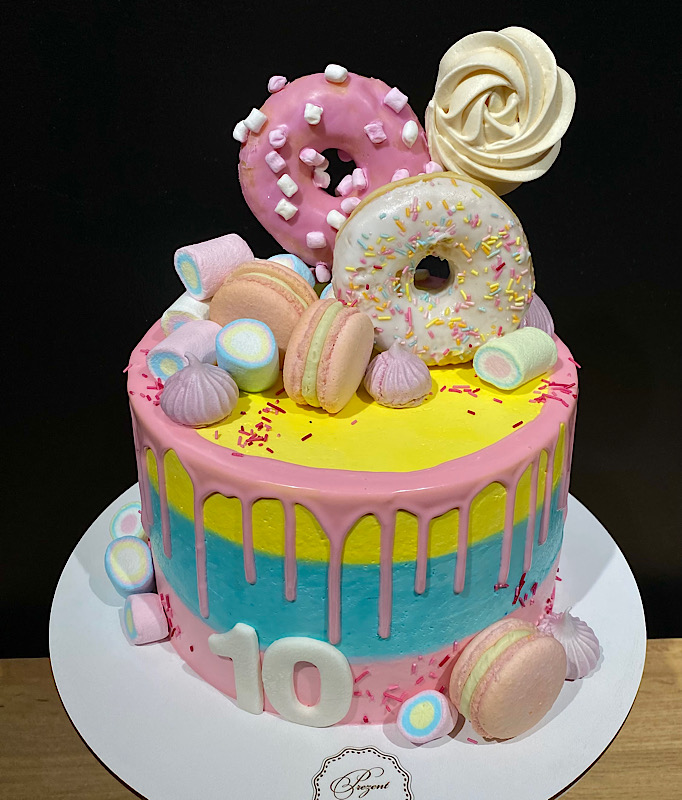 Яскравий кольоровий торт для дівчинки у ніжно- рожевих, жовтих та блакитних тонах. Покритий рожевою поливкою та прикрашений веселими солодощами — донатсами, маршмелоу, меренгами та макарунами. Внизу — святкова цифра 10. Солодкий, барвистий і радісний торт, що створює настрій справжнього дитячого свята!