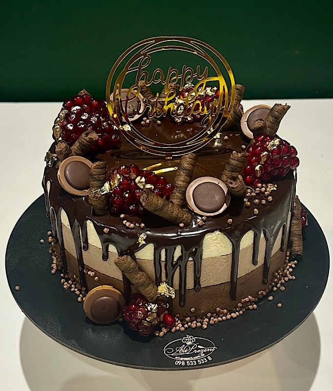 Торт «Три шоколади» — гармонія ніжності та смаку. Оксамитові шари білого, молочного та темного шоколаду вкриті шоколадною поливкою, прикрашені гранатом, улюбленими солодощами й золотим топером Happy Birthday. Стильно, святково й неймовірно смачно!
