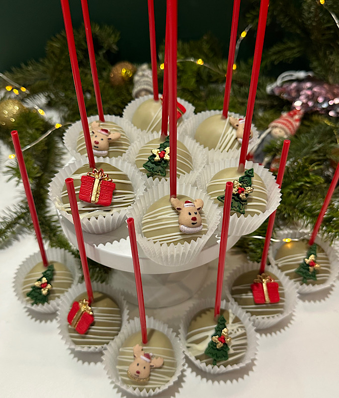 Зимові кейк-попси — святкові ласощі з ніжного бісквіту в шоколадній глазурі. Усередині — ароматна горіхова начинка зі згущеним молоком, насичена й по-справжньому домашня. Кожен кейк-попс декорований у зимовому стилі: ялинки, подарунки та милі олені створюють атмосферу казки й тепла. Виготовляються вручну з увагою до деталей — ідеальний вибір для новорічних свят, корпоративних подарунків і дитячих святкувань.