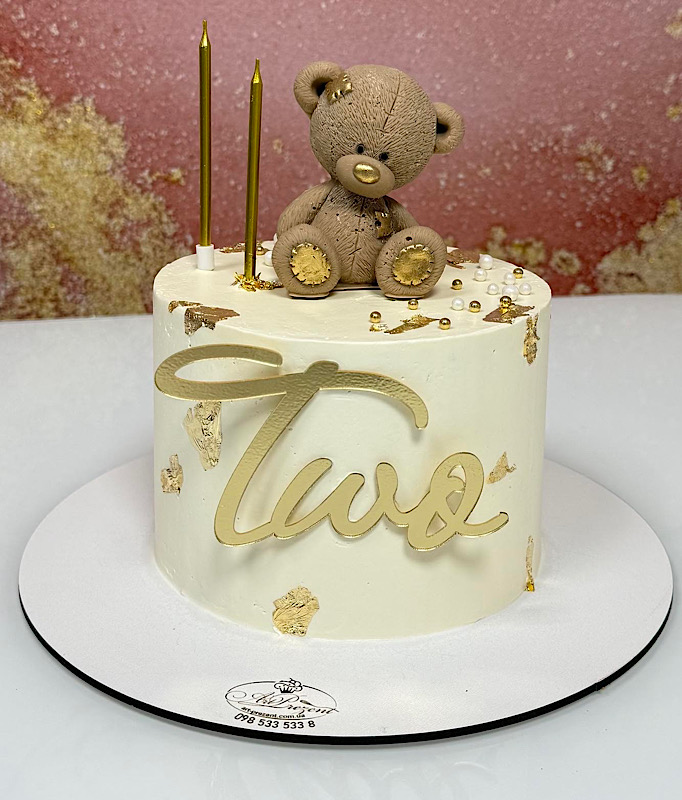 Торт на два рочки, у якому ніжність зустрічається зі святом. Золоті акценти додають магії, а шоколадний ведмедик — трішки дитячого щастя. Для особливого дня і найтепліших емоцій.