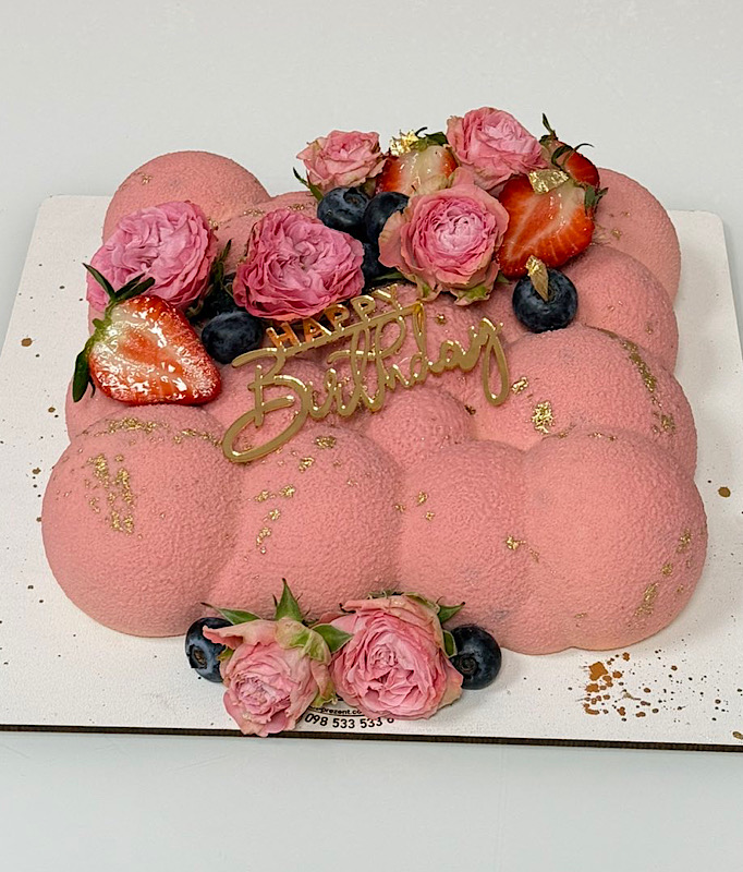 Ніжний, як хмаринка, і водночас ефектний — цей мусовий торт у формі бульбашок закохує з першого погляду. Оксамитове покриття з рожевого шоковелюру створює відчуття легкості та повітряності, а гра форм додає сучасного шарму. Золотий топер дарує святковий блиск, а свіжі ягоди й квіти наповнюють композицію живими барвами та витонченістю. Ідеальний вибір для особливих моментів, коли хочеться ніжності, стилю і трішки магії.