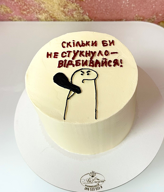 Торт для тих, хто не рахує роки — а просто відбивається від них із настроєм. «Скільки б не стукнуло — відбивайся!» Всередині — ніжний, смачний торт, а зовні — максимум характеру, гумору і настрою на святкування. Ідеальний варіант для тих, хто любить жарти, драйв і не сприймає вік надто серйозно.