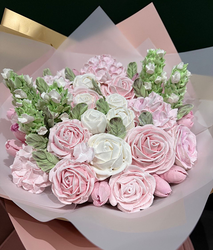 Ніжний зефірний букет у біло-рожевій гамі — справжня солодка альтернатива живим квітам. Повітряні троянди та гортензії з зефіру гармонійно поєднуються з витонченими бутонами тюльпанів і делікатною зеленню, створюючи легку, романтичну композицію. Букет виглядає вишукано, об’ємно й дуже святково — ідеальний подарунок для особливих моментів.