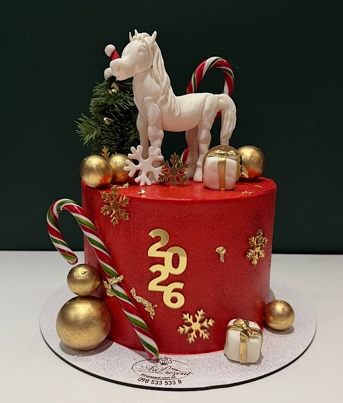 Новорічний торт “Рік Коня” — святковий червоний торт з білим конем, символом сили та удачі. Декор із сніжинками, ялинковими гілочками та золотими акцентами створює атмосферу зимової казки. Усередині ніжні бісквіти та крем, що дарують ідеальне поєднання смаку та краси. Ідеальний для новорічного свята та зустрічі Року Коня.