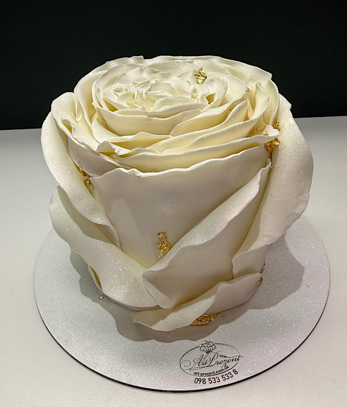 Вишуканий торт у вигляді білосніжної троянди, створений із ніжних їстівних пелюсток, які виглядають надзвичайно реалістично. Цей торт — справжній витвір мистецтва, що поєднує красу, ніжність та неповторний смак. Ідеально підходить для святкування особливих моментів або як подарунок, що дарує естетичне задоволення та тепло серця.