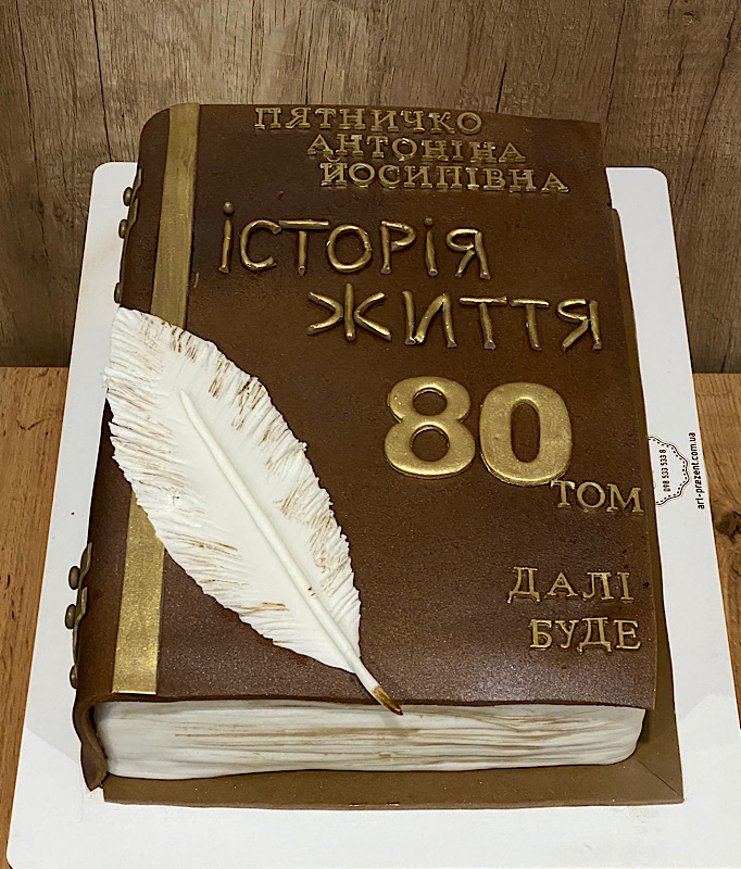 Торт у формі книги під назвою «Історія життя», створений спеціально до ювілею 80 років. Ніжне оздоблення та вишукані написи на «сторінках» передають тепло, любов і повагу до іменинниці. Декор доповнює елегантне перо — символ мудрості й життєвого досвіду, а золота цифра 80 підкреслює важливість і урочистість події. Торт сповнений ніжності, вдячності та шани до прекрасної жінки й її життєвої історії.