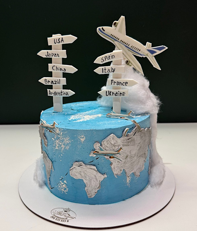 Неймовірний торт у блакитних тонах, створений для мрійників та мандрівників! На його поверхні — карта світу, літаки та великий літак у повітрі над пухнастими хмарами. Два вказівники з містами додають особливого шарму та індивідуальності. Цей торт — ідеальний подарунок для тих, хто любить подорожі та хоче зробити свято справді незабутнім.