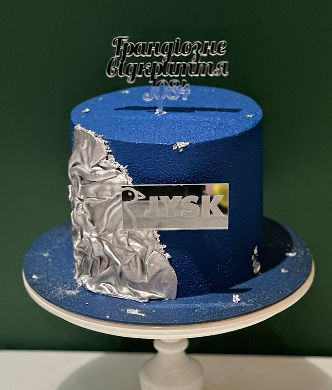 Торт створений спеціально для JYSK — в елегантному темно-синьому кольорі, що підкреслює стиль та стриману розкіш бренду. Бічний декор виконаний у срібних відтінках, додаючи святковості та виразності. Завершує композицію витончений топер зверху — символічний акцент на важливість події. Смак, що об’єднує. Дизайн, що надихає.