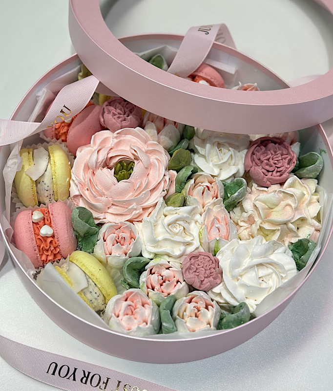 Композиція з витончених зефірних квітів та ніжних макаронсів у пастельних рожевих, жовтих та оливкових відтінках. Повітряний ягідний зефір у формі квітів, та делікатні французькі тістечка створюють ідеальну гармонію смаку й естетики. Подарунок, що говорить замість тисячі слів — про турботу, тепло й любов. Солодке диво, яке хочеться дарувати.