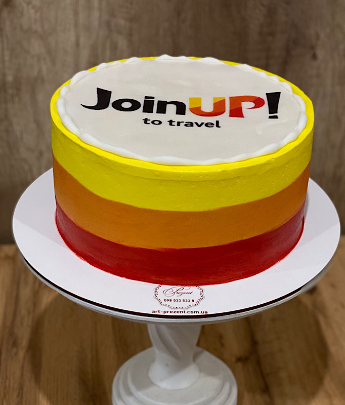 Стильний корпоративний торт для туристичної компанії Join UP! — у фірмових помаранчево- червоних та жовтих кольорах бренду, з яскравими акцентами, що передають атмосферу подорожей, сонця та натхнення. Верхівку торта прикрашає логотип компанії, який символізує єдність команди та любов до відкриттів. Ідеальний десерт для святкування нових маршрутів, перемог і яскравих вражень.