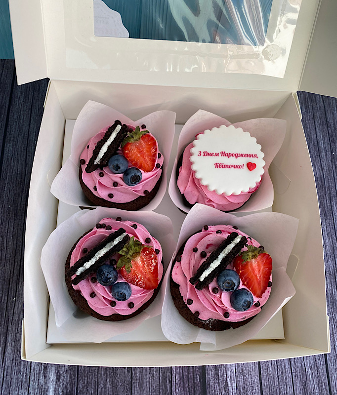 Ніжні капкейки з рожевим кремом, прикрашені свіжими ягодами та шматочками печива Oreo. Зверху акуратно розміщено надпис «З Днем народження», що додає святкового настрою. Ідеальний вибір для яскравого та смачного святкування!