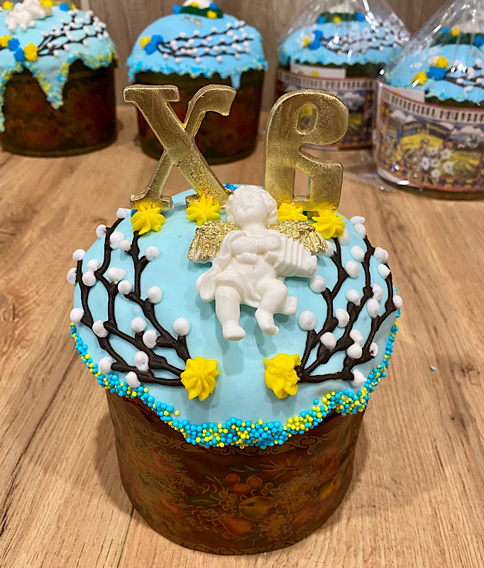 Великодня паска з ніжного здобного тіста з цедрою цитрусових, цукатами та родзинками. Зверху паска вкрита ніжною голубою глазур’ю та прикрашена гілочками верби, фігуркою ангела, золотими літерами «ХВ» і легкими жовтими меренгами. Світла, витончена й символічна — справжня окраса великоднього кошика.