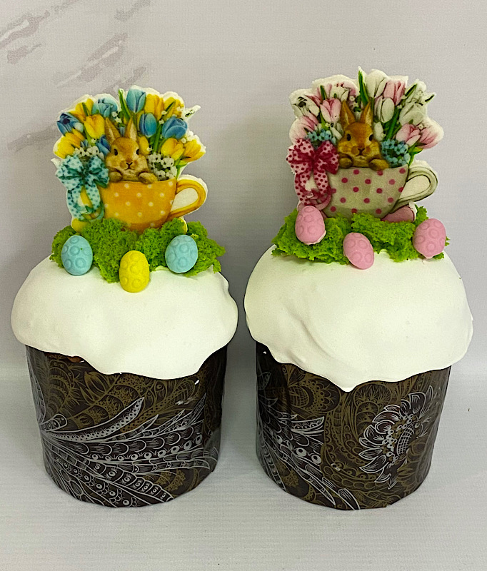 Дитяча великодня пасочка з ніжного здобного тіста з цедрою цитрусових, цукатами та родзинками. Паску прикрашає зображення горнятка, з якого виглядає милий зайчик, оточений весняними квітами. Декор виконаний у ніжних кольорах — окремо для хлопчиків та дівчаток. Світла, казкова і створена для маленьких поціновувачів великодніх солодощів.