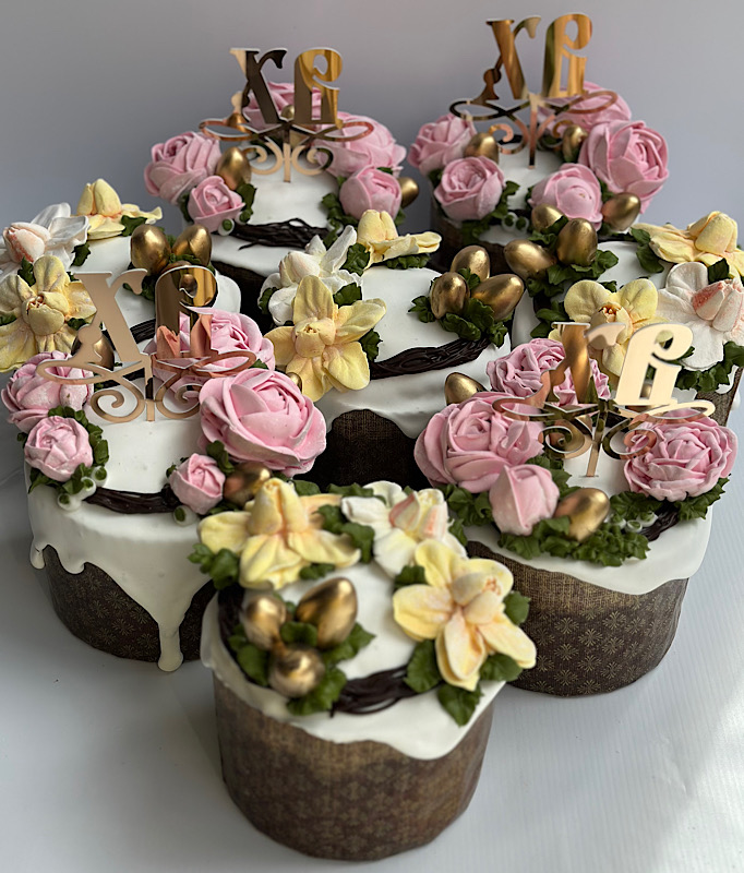 Великодні паски з особливим настроєм весни. Наша львівська паска — пухка, ароматна, з ніжною цитрусовою цедрою, родзинками та цукатами… та сама, що знайома з дитинства. А декор — це справжня ніжність: повітряні зефірні віночки, витончені квіти — троянди й нарциси, доповнені золотими шоколадними яєчками. Кожна паска виглядає як святкова композиція, створена з любов’ю до деталей. Ідеально для великоднього кошика, родинного столу чи як вишуканий подарунок.