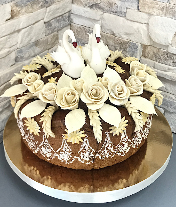 Одноповерховий весільний коровай – символ єдності та щастя молодят. Він оздоблений лебедями, квітами та колосками з тіста, що уособлюють любов, гармонію та родинний добробут. Елегантний і витончений, він стане справжньою прикрасою вашого святкового столу.