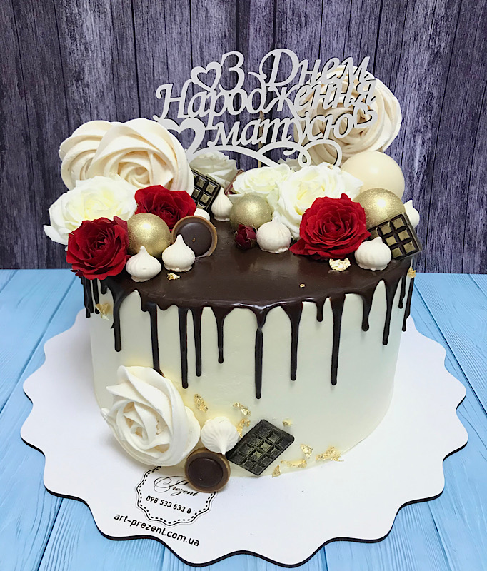 Ніжний білий торт із чорною шоколадною поливкою — вишукане поєднання контрастів і смаку. Декорований червоними та білими трояндами, мініатюрними шоколадками й легкими меренгами. Завершує композицію елегантний топер із написом «З Днем народження, матусю!» — солодке зізнання в любові найріднішій.