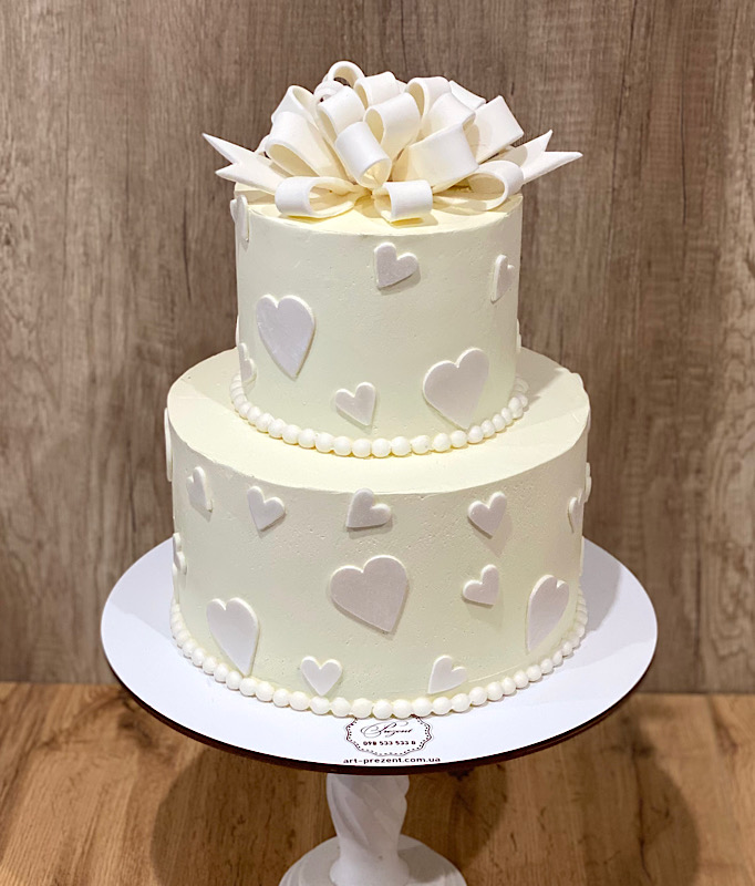 Вишуканий двоповерховий весільний торт у ніжному, романтичному стилі. Прикрашений елегантним бантом зверху, що додає йому святковості та грації. По всьому торту — декоративні серця різних розмірів і білі буси, які створюють атмосферу ніжності, любові та урочистості. Ідеальний десерт для найчарівнішого дня у житті закоханих.