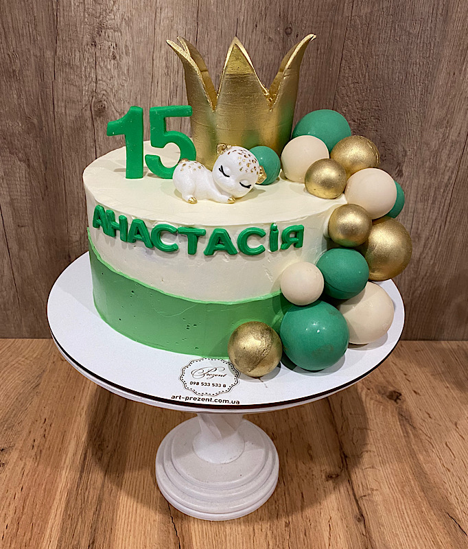 Вишуканий біло-зелений торт для ювілею краси та молодості. Торт прикрашений розкішною золотою короною — символом свята та королівської елегантності. На вершині — цифра 15, що нагадує про особливий день та маленьке, миле оленятко. Каскад їстівних шоколадних куль у відтінках білого, зеленого та золота створює ефект розкоші й святковості. Ідеальний торт для справжньої принцеси!