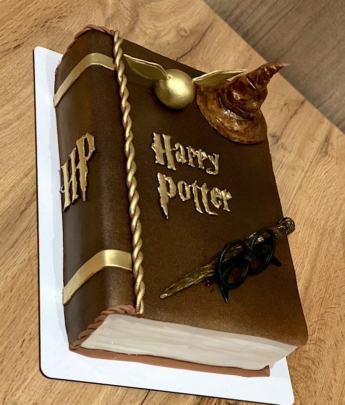 Торт у вигляді закритої книжки «Гаррі Поттер» — справжня солодка магія для фанатів чарівного світу. Детально пророблена обкладинка з золотим написом «Гаррі Поттер», доповнена тематичними елементами: чарівною указкою, знаменитими круглими окулярами, чаклунською шапкою та золотим стічем. Кожен елемент декору створений вручну та наповнений атмосферою пригод, дружби й магії. Цей торт — наче портал у Гоґвортс, де здійснюються найзаповітніші бажання.