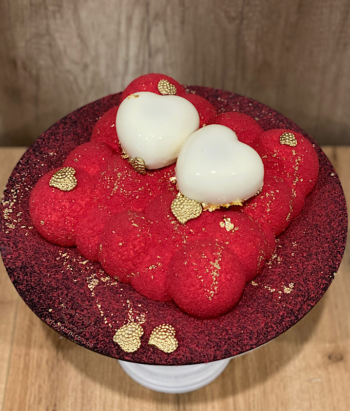 Мусовий торт у формі бульбашок — справжня гра текстур і емоцій. Покритий насиченим червоним шоковелюром, він виглядає ефектно та сучасно. Композицію доповнюють два мусові тістечка у формі сердечок, вкриті дзеркальною глазур’ю — ніжний акцент про любов та турботу. Десерт, що підкорює погляд і смак з першої миті.