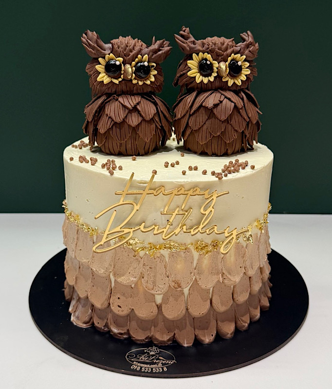 Круглий торт із совами виглядає дуже символічно й витончено. Зверху розміщені дві сови — як образ мудрості, гармонії та тепла. Бокова частина торта оздоблена фактурними мазками крему, що створюють ефект крил сови, та золотим топером. Лаконічний, але водночас виразний торт, який привертає увагу своєю ідеєю та деталями.