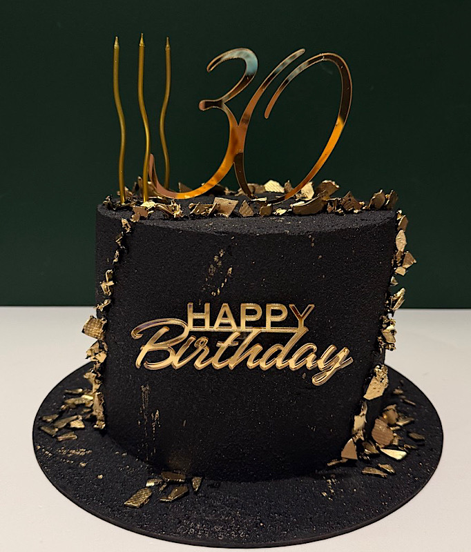 Тори мужчині на 30 років. Чорний шовковий велюр із золотими бризками, золоті кристали та благородний декор у золотих відтінках. Торт прикрашений топером Happy Birthday, цифрою 30 та золотими свічками — ідеальне поєднання мінімалізму й розкоші.