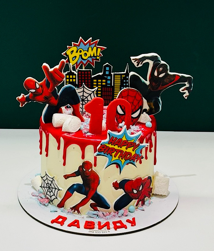 Торт з Людиною-павуком на замовлення — популярний дитячий тематичний торт для дня народження. Дизайн виконаний у червоно-білих кольорах із зображеннями улюбленого супергероя. Усередині — ніжний бісквіт та смачна кремова начинка з натуральних інгредієнтів. Можливе додавання імені, віку іменинника або індивідуальні зміни дизайну. Такий торт створює справжню атмосферу пригод і робить свято незабутнім.