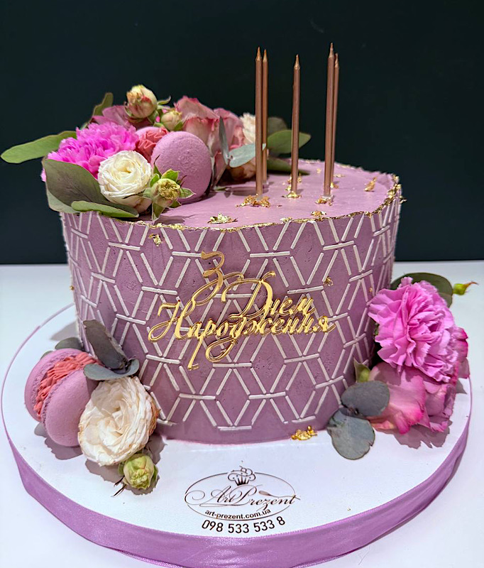 Фіолетовий торт з живими квітами та макаронсами — це поєднання вишуканого дизайну, сучасних трендів і ніжного смаку. Торт виконаний у стильних фіолетових відтінках, прикрашений натуральними квітами та витонченими макаронсами, що робить його справжньою окрасою святкового столу. Такий торт ідеально підходить для дня народження, ювілею, весілля, дівич-вечора, фотосесії або іншої особливої події. Ми виготовляємо торти на замовлення з натуральних інгредієнтів, пропонуємо великий вибір начинок та індивідуальний підхід до кожного клієнта.