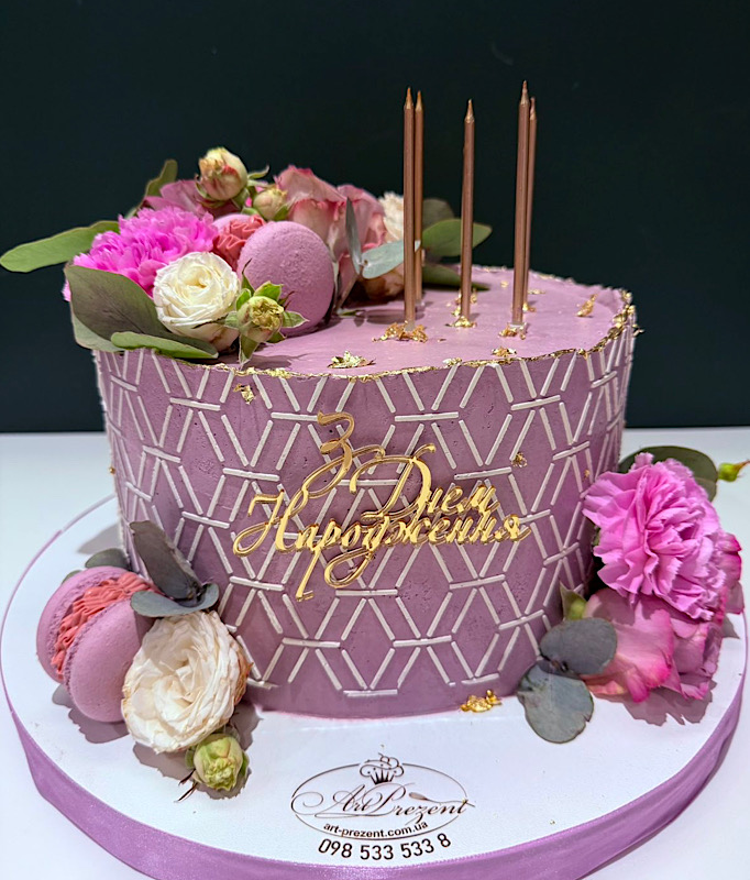 Вишуканий торт у бузкових тонах, створений спеціально для неї. Декорований живими квітами та витонченими макаронсами, він поєднує легкість, елегантність і святковий настрій. Ніжний орнамент на боках додає витонченості, а топер «З Днем народження» завершує образ особливого торта для незабутнього свята.