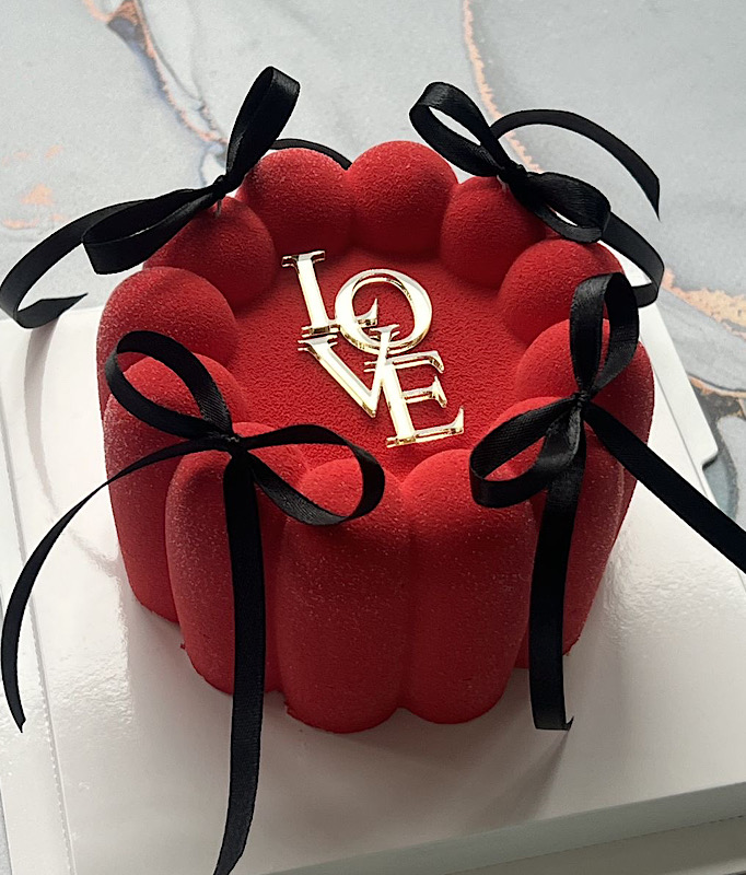 Масовий бенто торт покритий червоним шоковелюром доповнений золотим надписом Love та атласними бантиками. Стильний, вишуканий та дуже смачний. Подарунок на День Закоханих.