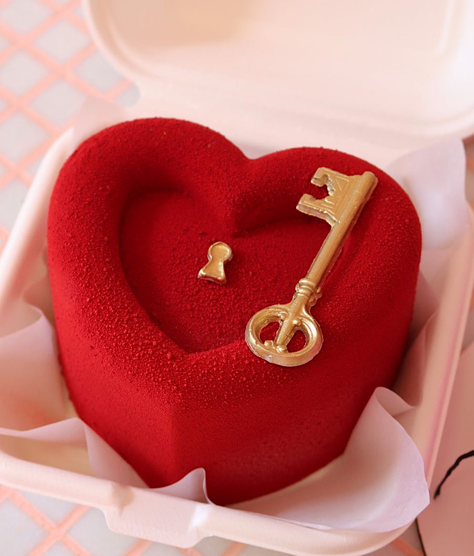 Мусовий бенто-торт у формі серця, покритий глибоким червоним шоковелюром — як символ пристрасті, любові та таємниці. Декор доповнює витончений замок із золотим ключем — знак довіри, особливого зв’язку й серця, відчиненого лише для однієї людини. Ідеальний солодкий акцент для зізнання, річниці чи подарунка «без слів».
