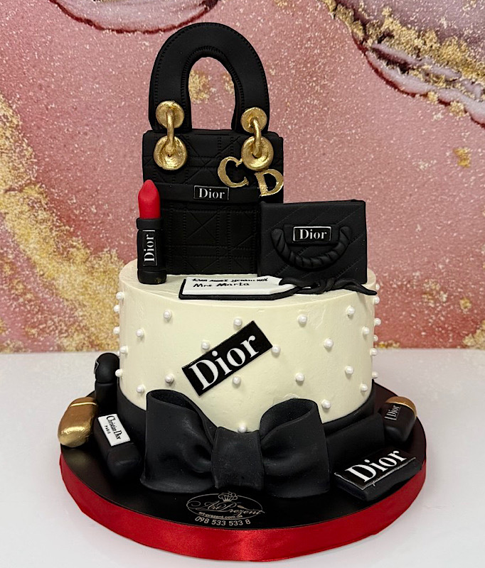 Стильний торт у дизайнерському стилі Dior — ідеальний вибір для святкування дня народження або особливої події. Торт виконаний у білому кольорі з ніжними перлинками, доповнений елегантним чорним бантом та декором у вигляді сумочки, помади й фірмового пакета Dior. Такий торт чудово підійде для дівчини, жінки або поціновувачів моди та брендової естетики. Заказать торт із індивідуальним дизайном можна для будь-якого свята — гарантуємо ефектну подачу та неперевершений смак.