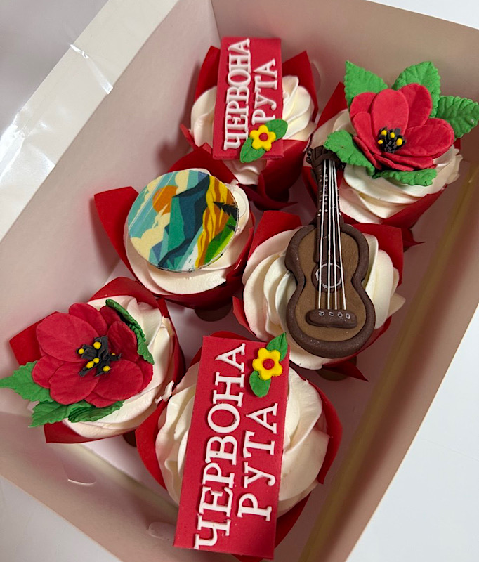 Яскраві та атмосферні капкейки, натхненні легендарною піснею «Червона рута». Десерти оформлені у стильному тематичному дизайні: ніжні квіти, гітара та напис «Червона рута» створюють особливий настрій свята. Кожен капкейк — це поєднання естетики та смаку: акуратний декор, гармонійні кольори та продумані деталі роблять їх ідеальним вибором для тематичних вечірок, концертів або подарунка для поціновувачів української музики.
