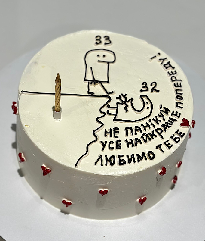 Торт із гумором і правильним меседжем: Не панікуй — усе найкраще попереду. А солодкий настрій починається вже зараз. Торт з приколом на 33 роки.
