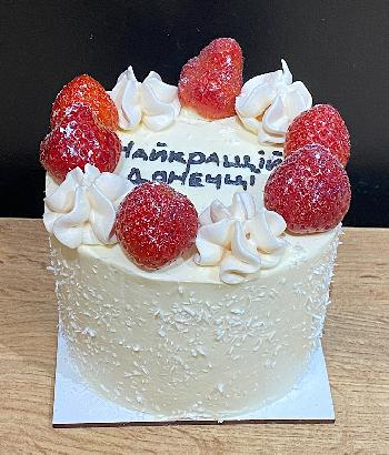 • 																					Вершковий бісквіт, ванільний чізкейк, полуничне компоте, полуничний крем