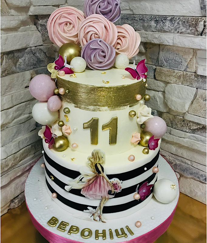 Ефектний двоповерховий торт для дівчинки на 11 років. Нижній ярус виконаний у чорно-білу смужку з силуетом дівчинки на фоні, що додає стилю та оригінальності. Верхній ярус прикрашає золота цифра 11. Десерт оздоблений шоколадними кульками, ніжними метеликами, меренгами та перлинками — святковий і водночас дуже витончений торт, який стане справжньою окрасою дня народження.