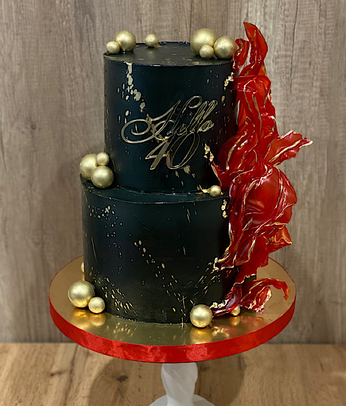 Ефектний двоповерховий торт у чорному кольорі — втілення стилю та розкоші. Поверхню прикрашають золоті бризки, що надають святкової елегантності, а доповнюють композицію блискучі золоті шоколадні кульки. Родзинка оформлення — каскад з червоних твіст-листів, які створюють динамічний акцент і додають торту вишуканого характеру. Завершує образ золотий топер Hello 40, що яскраво підкреслює особливість ювілейного свята.