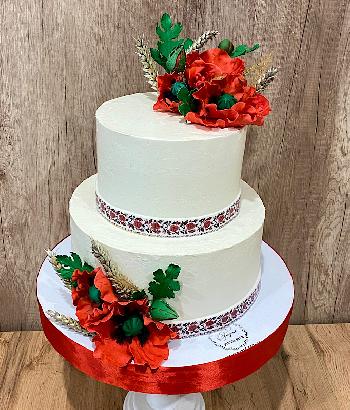 Двоповерховий весільний торт у білому кольорі — вишуканий символ ніжності та українських традицій. Низ торта оздоблений стрічкою з орнаментом української вишивки, що додає йому автентичного шарму. Декор доповнюють яскраві пучки їстівних маків із зеленими листочками та золотистим колоссям пшениці — як побажання кохання, добробуту й щасливого подружнього життя.