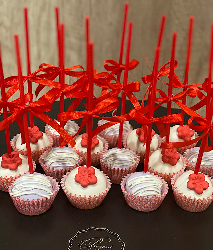 Ніжні кейк-попси у витончених бузкових, червоних та білих відтінках виглядають неймовірно святково та елегантно. Декоровані ніжними червоними квіточками та легкою шоколадною павутинкою, вони поєднують у собі вишуканість і ніжність. Червоні палички з атласними бантиками гармонійно доповнюють композицію, додаючи акценту й святкового шарму.