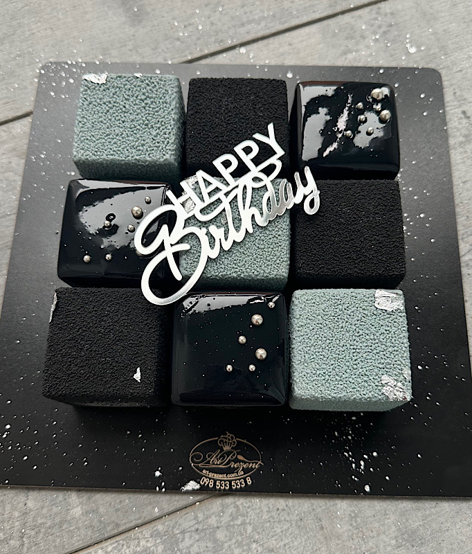 Муссовые пирожные-кубики, викладені у формі маленького тортика — стильна альтернатива класичному святковому десерту. Глибокі чорні та сірі відтінки, лаконічний декор і топер Happy Birthday створюють атмосферу сучасної елегантності. Ідеально для тих, хто любить мінімалізм, стиль і витончений смак.