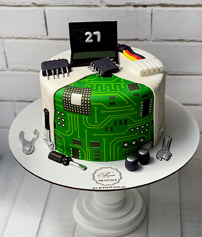 Торт з компʼютером на 27 років. Ефектний святковий торт для справжнього майстра комп’ютерної техніки. На верхівці — модель комп’ютера, а навколо розміщені їстівні фігурки інструментів: ключі, викрутки та кусачки. Передня частина торта оформлена зображенням мікросхем та комп’ютерних плат, що створює атмосферу цифрового світу та технічної майстерності. Ідеальний вибір для того, хто живе технологіями, любить ремонтувати, створювати та вдосконалювати.