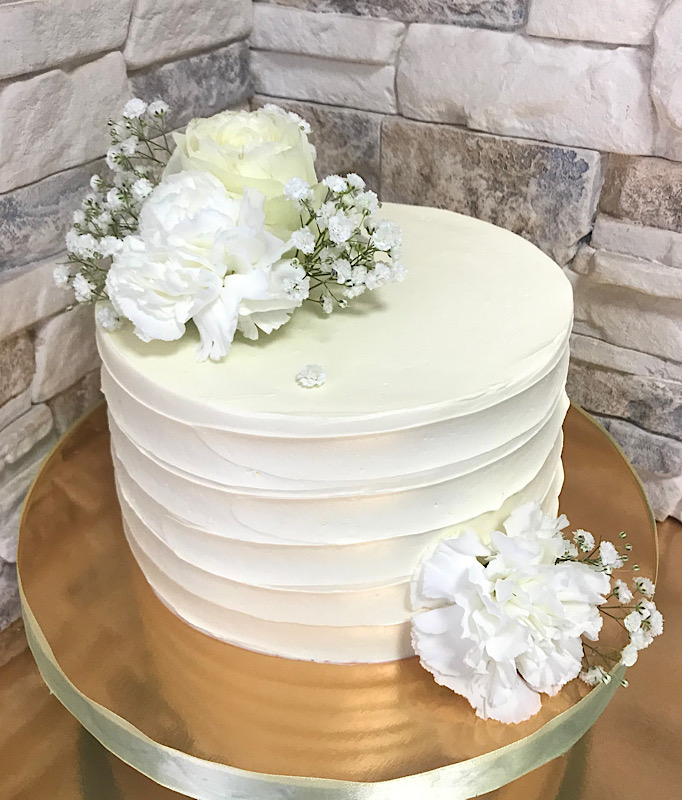 Мініторт із живими квітами — ніжність у кожній деталі. Боки оздоблені кремом зі структурою стильних смугастих полосок, а зверху композиція зі свіжих квітів додає вишуканості та легкості. Ідеальний вибір для камерного святкування чи ніжного подарунку.