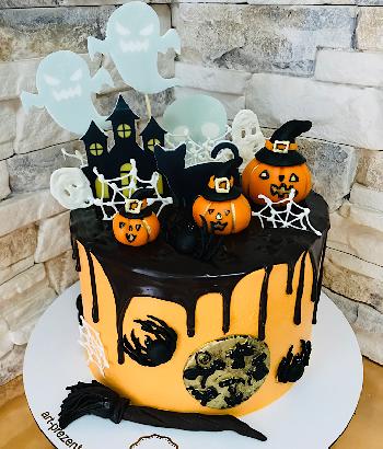Містичний торт до Хелловіну, що занурює у світ казки та загадок. Чорний замок у центрі композиції огортають примарні привиди, а навколо нього розташувались яскраві гарбузи. Атмосферу доповнюють павутина з павуками та чорна мітла — символ справжнього чаклунства. Такий десерт стане головною окрасою святкового столу та подарує відчуття справжньої магії