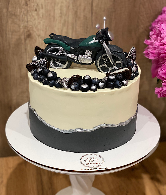 Білий торт із стильним сірим бортиком, що додає йому сучасного вигляду. Зверху — їстівна фігурка чорно-зеленого мотоцикла, яка привертає увагу й створює динамічний настрій. Композицію доповнюють свіжі ягоди лохини та печиво Oreo — смачний фінальний штрих для справжнього поціновувача швидкості й солодощів.